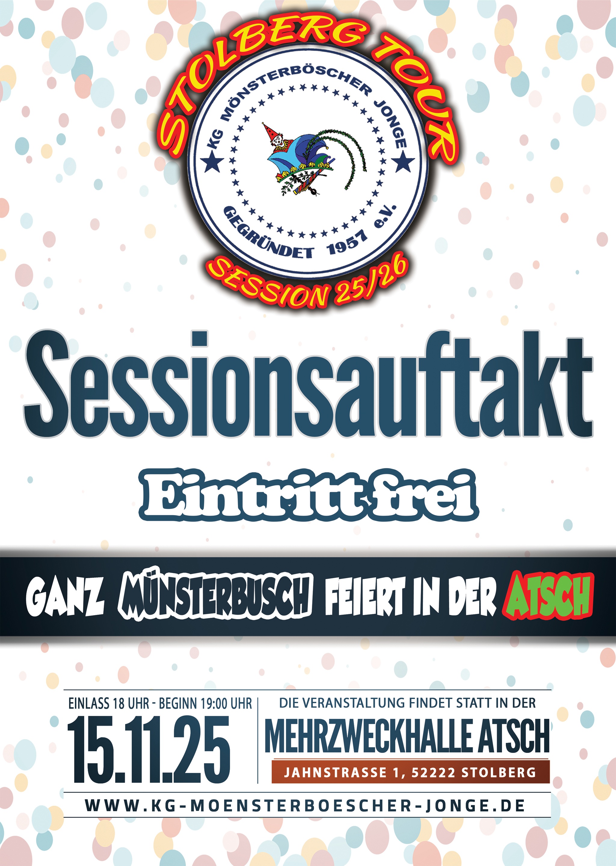 Wegen des Brandes im Jugendheim und den laufenden Umbauarbeiten ziehen wir dieses Jahr mit unserem Sessionsauftakt um – und zwar in die Atsch!Unter dem Motto „Ganz Münsterbusch feiert in der Atsch“ laden wir euch alle ganz herzlich am 15. November 2025 ab 18 Uhr in die Mehrzweckhalle Atsch ein – Eintritt frei!